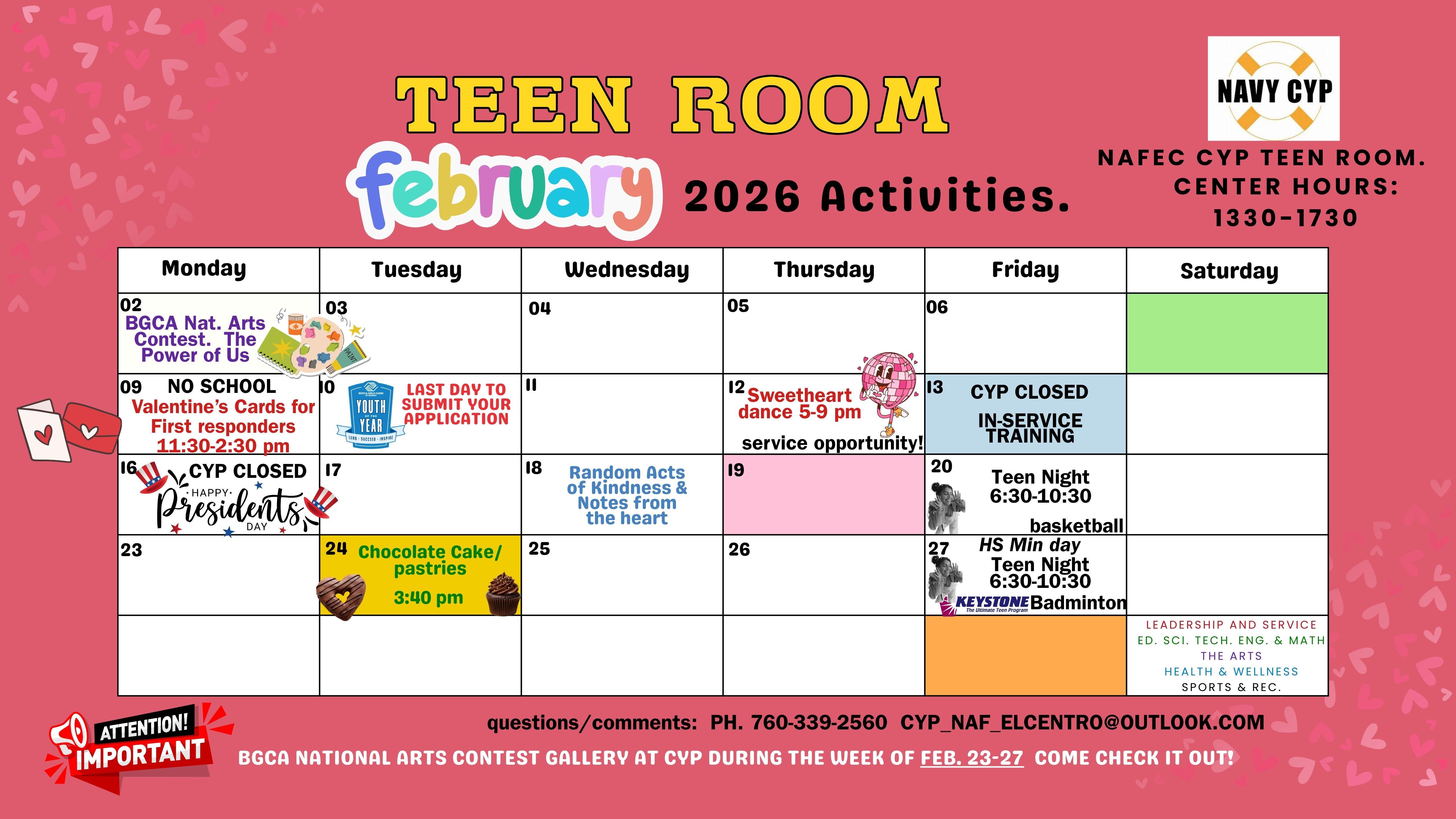 The Teen & Youth Center offers a variety of “out of school” programs for youth attending Kindergarten – 12th grade which are designed to enhance rather than duplicate the school day. The Teen & Youth Center is composed of two programs: School Age Care & Teen Program. A variety of programs are offered throughout the year to enhance and support the military/DoW experience in El Centro. The Teen and Youth Center is a proud member of the Boys and Girls Club of America and 4-H affiliate. Programmed activities include the Navy Core Programming Areas of Leadership, STEM, Health & Wellness, The Arts, and Sports & Recreation. Our goal is to support your youth’s development by offering high-quality programs and building positive relationships with peers and caring adults.